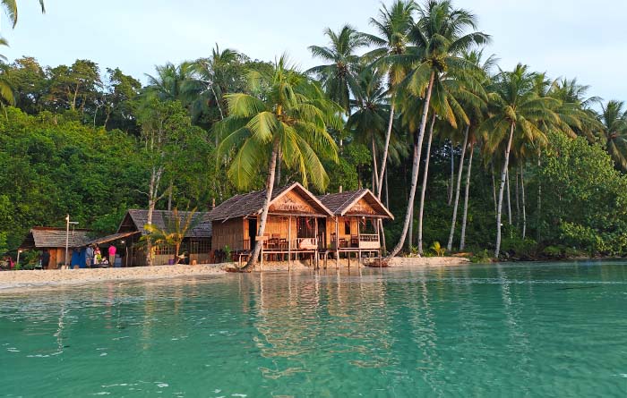 Four private beach bungalows occupy an eastward facing cove opposite Pulau Boni. A freshwater stream emerges from the wildlife-rich jungle behind the homestay. Low tide reveals a wide, sandy beach.