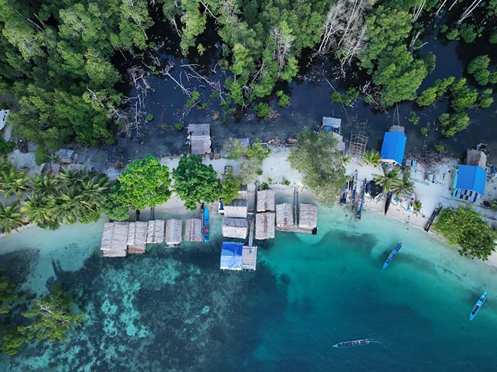 Located on a narrow sand spit between the ocean and a tidal mangrove lagoon, Saudori Homestay has a rich house reef and crystal clear water that provides excellent snorkelling (bring your own gear).