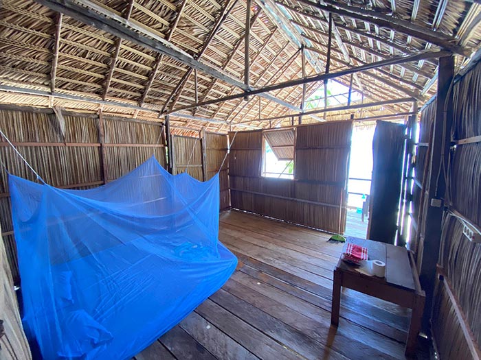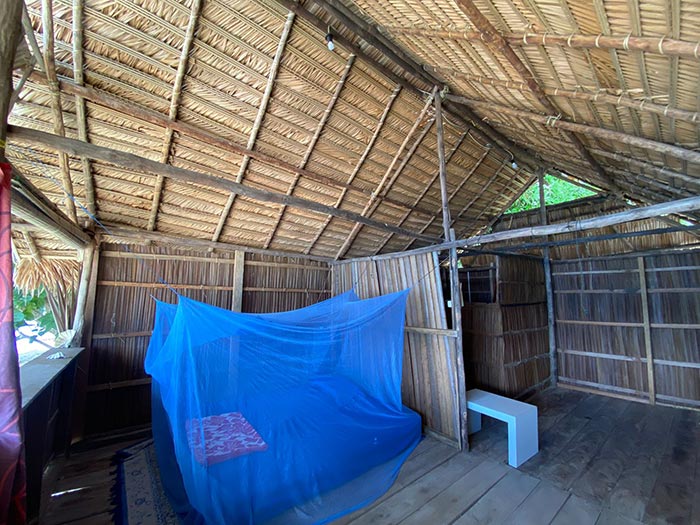 The bungalows sleep two on a mattresses on the floor. Mosquito nets, sheets and pillows and bath towels are provided. The bungalows are equipped with light switches and power outlets.