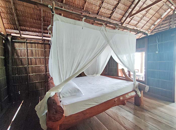 A single VIP bungalows sit in the shade of beachside trees. The bungalow sleeps two on a raised bed. Extra bedding can be provided for a third guest if need be. The ensuite bathroom has a western style toilet and dip mandi (bucket) bathing.